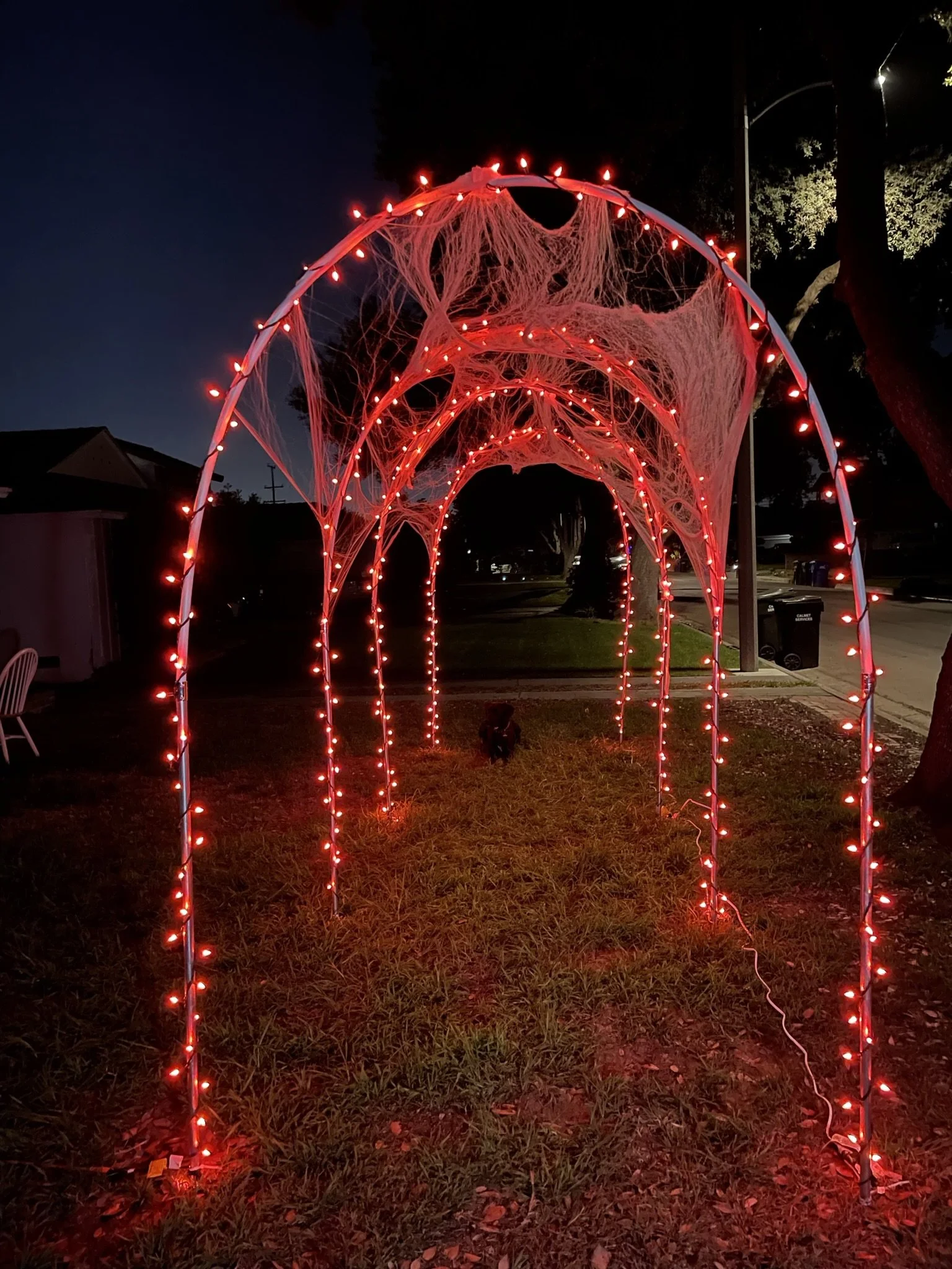 Spook up your Halloween with our Warm Orange Archway, featuring festive orange lights. Each archway is $60, including materials and installation. Please note, webs are available for an additional charge.